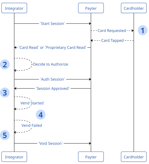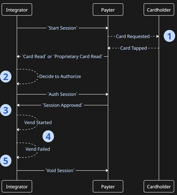 In this web sequence diagram, Payter details the core flow of an EMV payment which is successfully authorized, but due to either a vend failure or an error, no vend takes place. In this case, the Authorization must be voided to return the reserved funds to the cardholder.