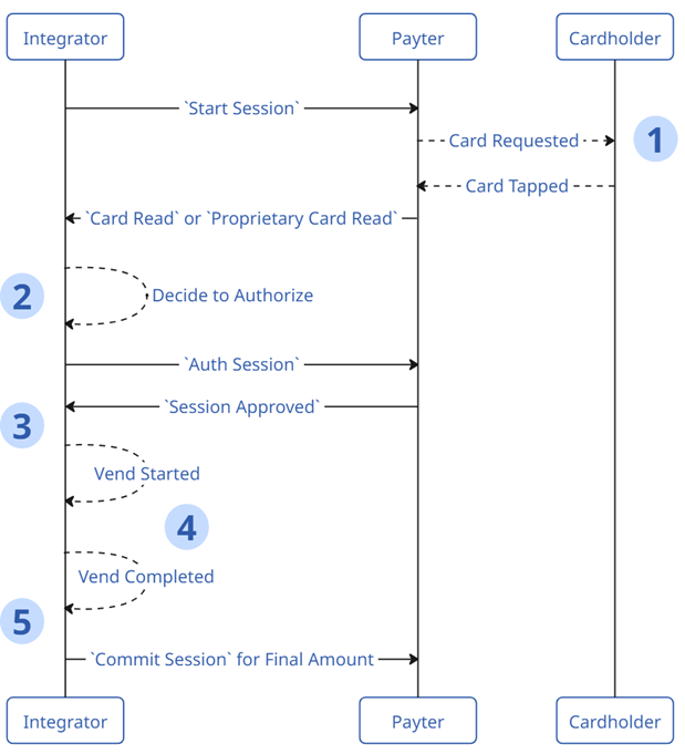 In this web sequence diagram, Payter details the core flow of an EMV payment which is successfully authorized, and later committed. In this case, the Committed amount is less than or equal to the Authorized amount, for simplicity.