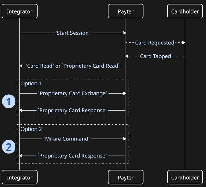 Proprietary Card Exchangeis used to send data to the card e.g. a Command Application Protocol Data Unit (CAPDU).Mifare Commandis used to read or write data to a Mifare card.