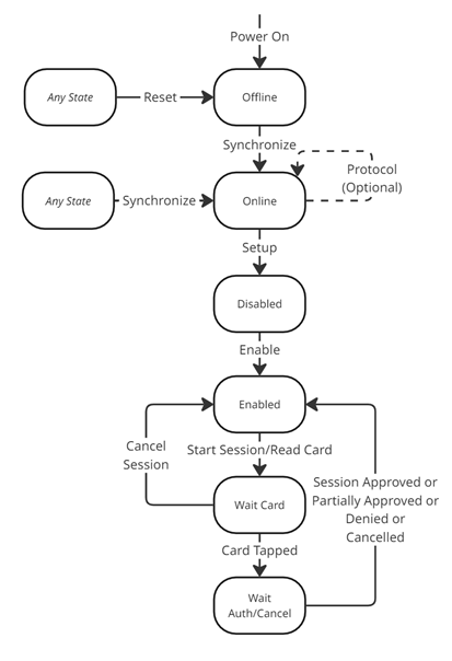 As previously detailed in Communication Setup, the PSP state must be Enabled prior to initiating any cardholder interaction. Below is an overview of this state flow.